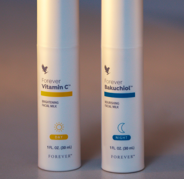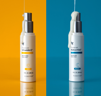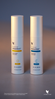 Enjoy targeted skincare around the clock with a daily-use duo featuring Forever Vitamin C™ Brightening Serum and Forever Bakuchiol Nourishing Serum.